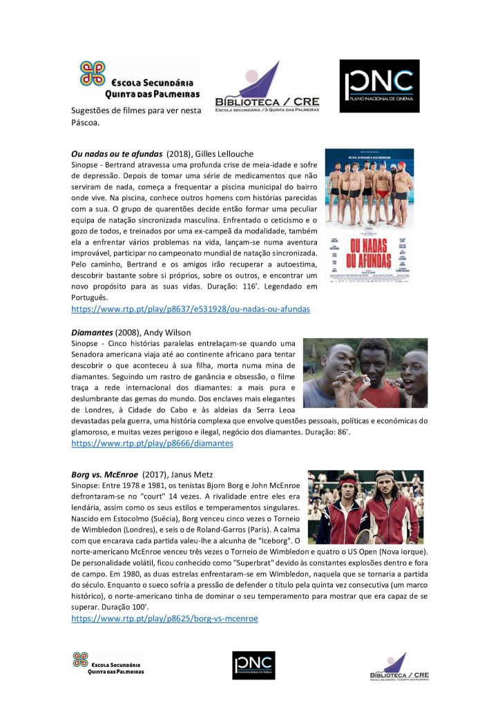 A equipa coordenadora do Plano Nacional de Cinema (PNC) da nossa escola (ESQP) recomenda que, nesta Páscoa, vejam cinema em casa. Deixamos aqui o nosso contributo com algumas sugestões de filmes.Esperamos que sejam do vosso agrado!#fiqueemcasa com o melhor cinema!