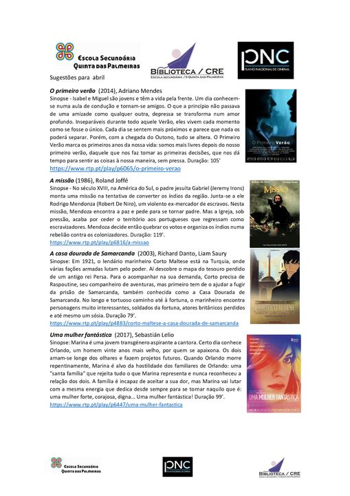 Os dinamizadores do PNC apresentam sugestões de 4 filmes que variam no tempo, no espaço e nas temáticas…, todos disponíveis em RTP Play. Esperamos que sejam do vosso agrado! #fiqueemcasa com o melhor cinema!