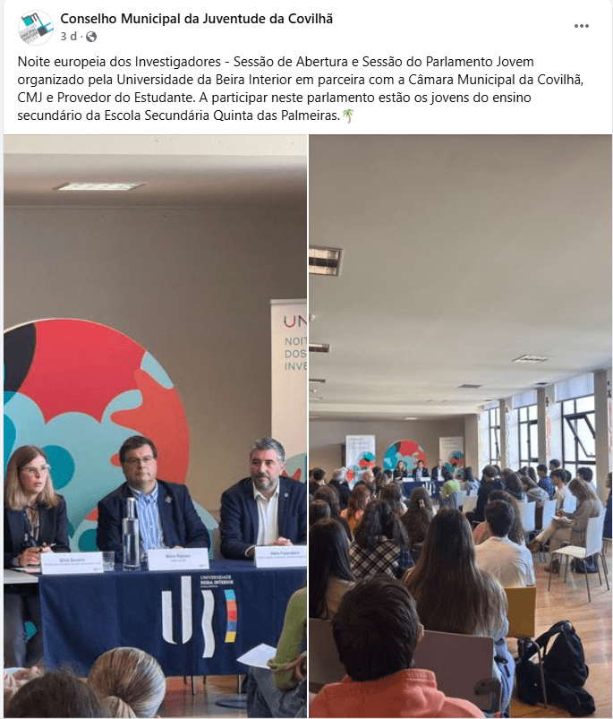 Esta iniciativa foi organizada com o apoio do Conselho Municipal da Juventude da Covilhã, em colaboração com a Provedoria do Estudante da UBI, com o Curso de Ciência Política e Relações Internacionais e com a Coolabora. Os alunos, acompanhados pela professora de Cidadania e Desenvolvimento e pelos professores de Filosofia, debateram o Projeto de Resolução apresentado pela organização e fizeram propostas concretas de alteração do documento, revelando elevado sentido de ética e capacidade de ouvir, de respeitar as opiniões, de argumentar e de comunicar.